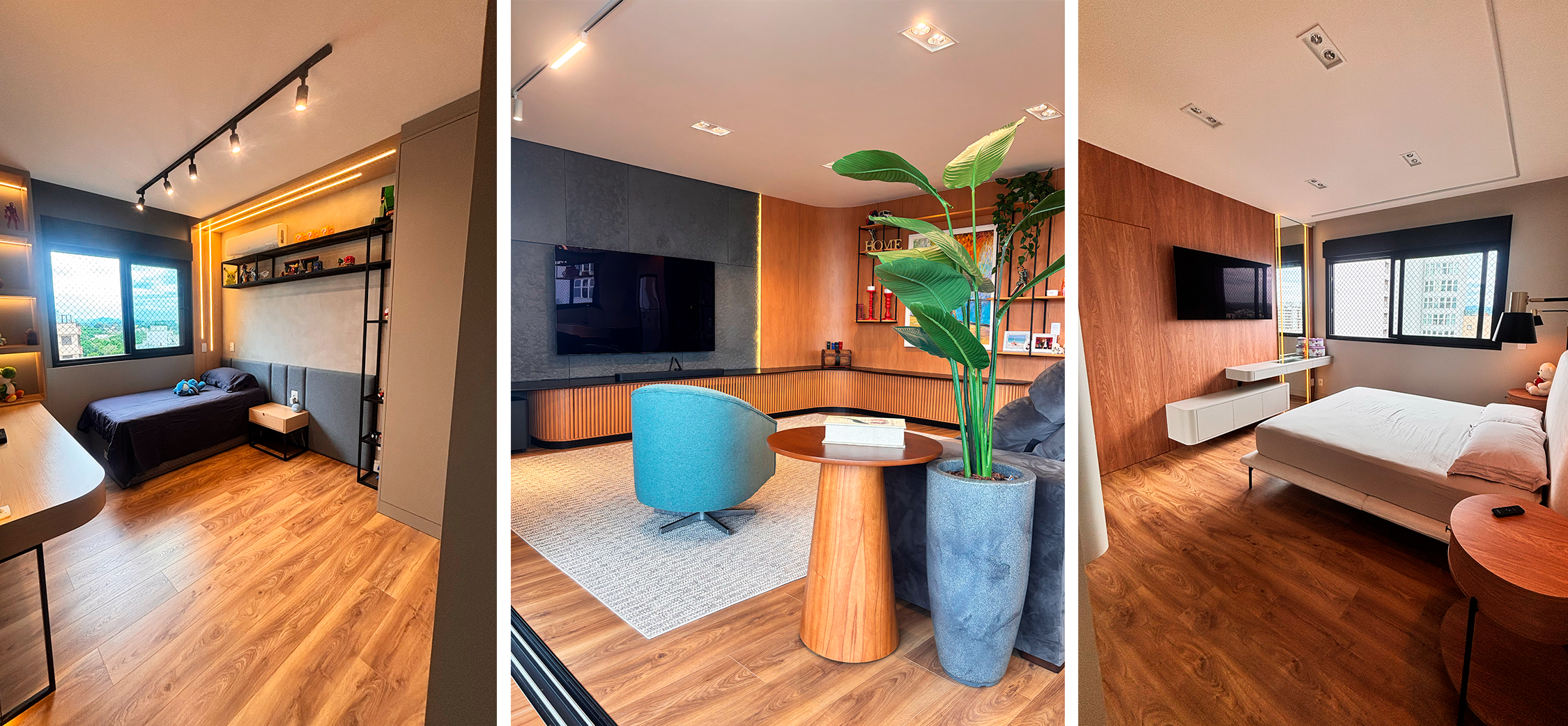 Quando mostramos este apartamento no fim do ano passado em nossas redes sociais, ele ainda existia apenas nas imagens 3D. Hoje, voltamos para apresentar cada ambiente finalizado, vivido e cheio de personalidade. A execução da Moderna Planejados, em parceria com a Effes Arquitetura, transformou ideias em espaços reais, acolhedores e funcionais.